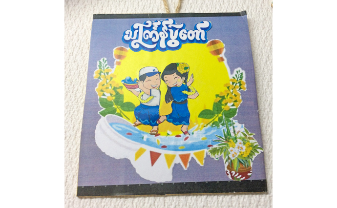 ミャンマーの"水かけ祭り"をモチーフにした色紙の壁飾りです。
