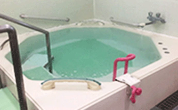 スタッフ介助の下安全に入浴が行えます。写真の「緑茶風呂」など香りが良く体に良い変わり湯も随時行っています。
