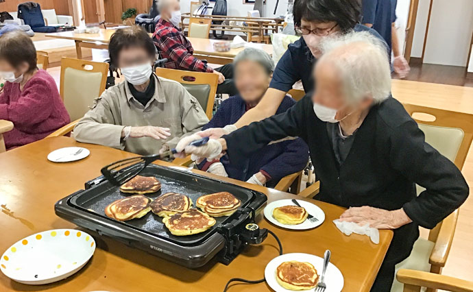 今月の昼食つくりはお好み焼きです!! ホットプレートを使って食材を切ったり焼いたり 利用者様だけでなくスタッフも楽しみました(^^♪